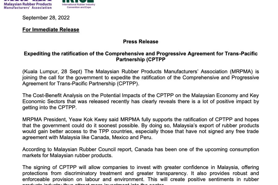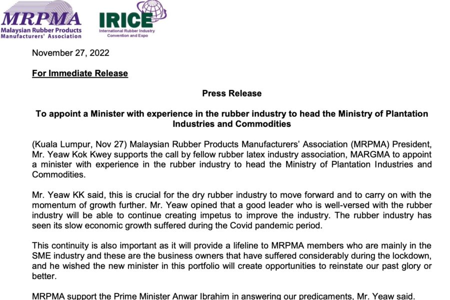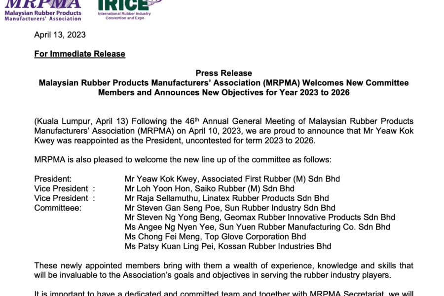 International Rubber Industry Convention and Expo 2027 The International Rubber Industry Convention and Expo (IRICE) is organised by the Malaysian Rubber Products Manufacturers’ Association (MRPMA), representing the country’s natural dry rubber manufacturers. IRICE plays a key role in advancing the rubber industry through market development, technology innovation, and policy advocacy…