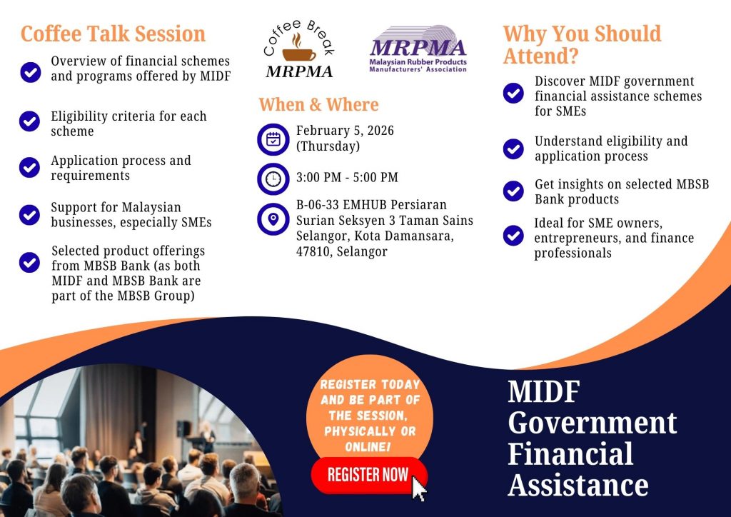 MRPMA is pleased to invite you to our upcoming Coffee Talk Session featuring MIDF, focusing on Government Financial Assistance available to Malaysian businesses, particularly SMEs.