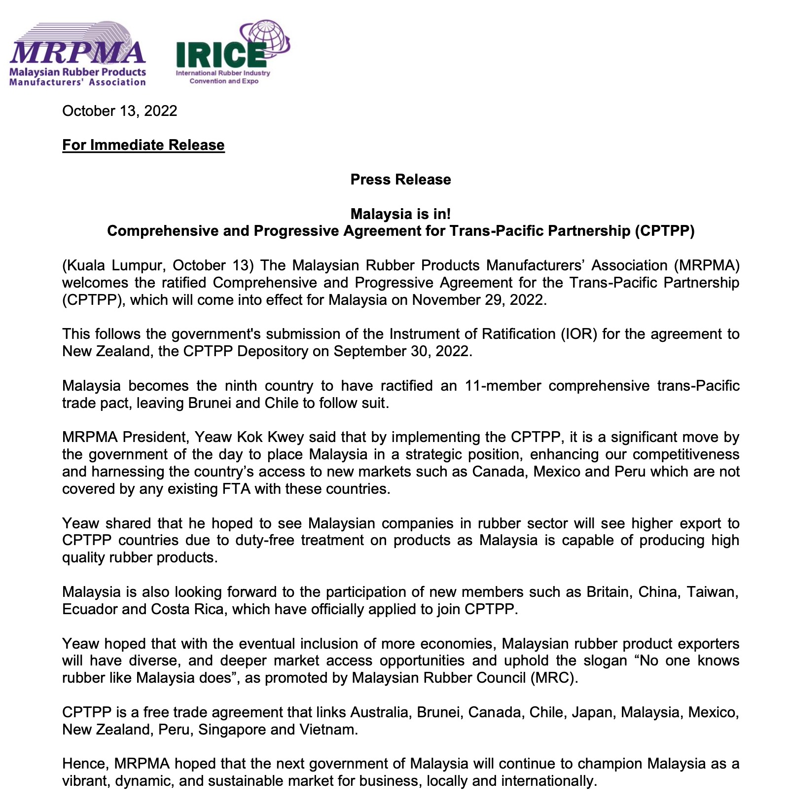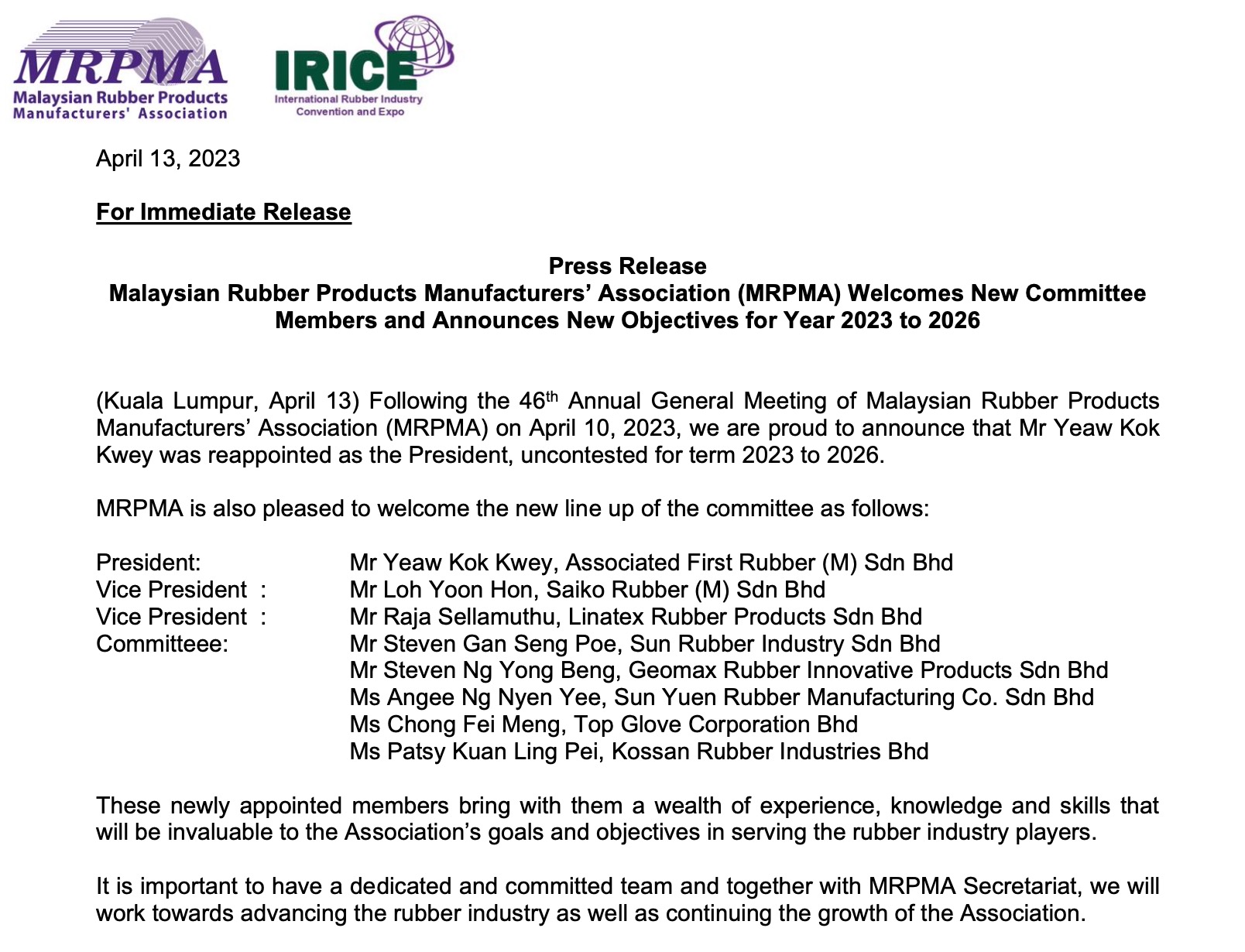 International Rubber Industry Convention and Expo 2027 The International Rubber Industry Convention and Expo (IRICE) is organised by the Malaysian Rubber Products Manufacturers’ Association (MRPMA), representing the country’s natural dry rubber manufacturers. IRICE plays a key role in advancing the rubber industry through market development, technology innovation, and policy advocacy...