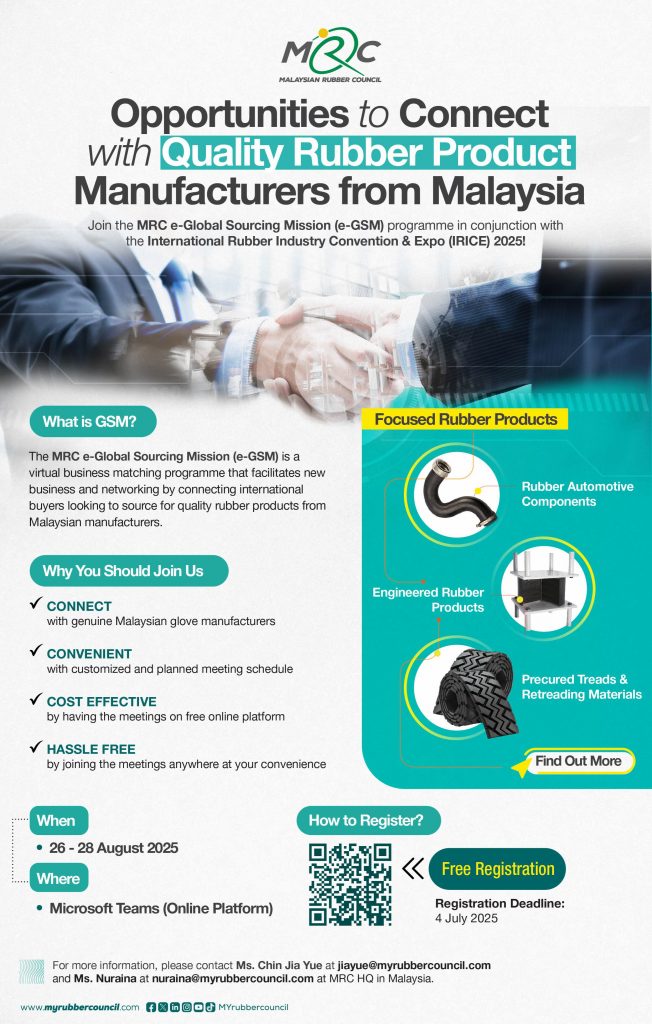 In conjunction with the International Rubber Industry Convention & Expo (IRICE) 2025, MRC is organizing an e-Global Sourcing Mission (e-GSM) — a virtual business matching programme that connects international buyers with trusted Malaysian manufacturers of dry rubber products.